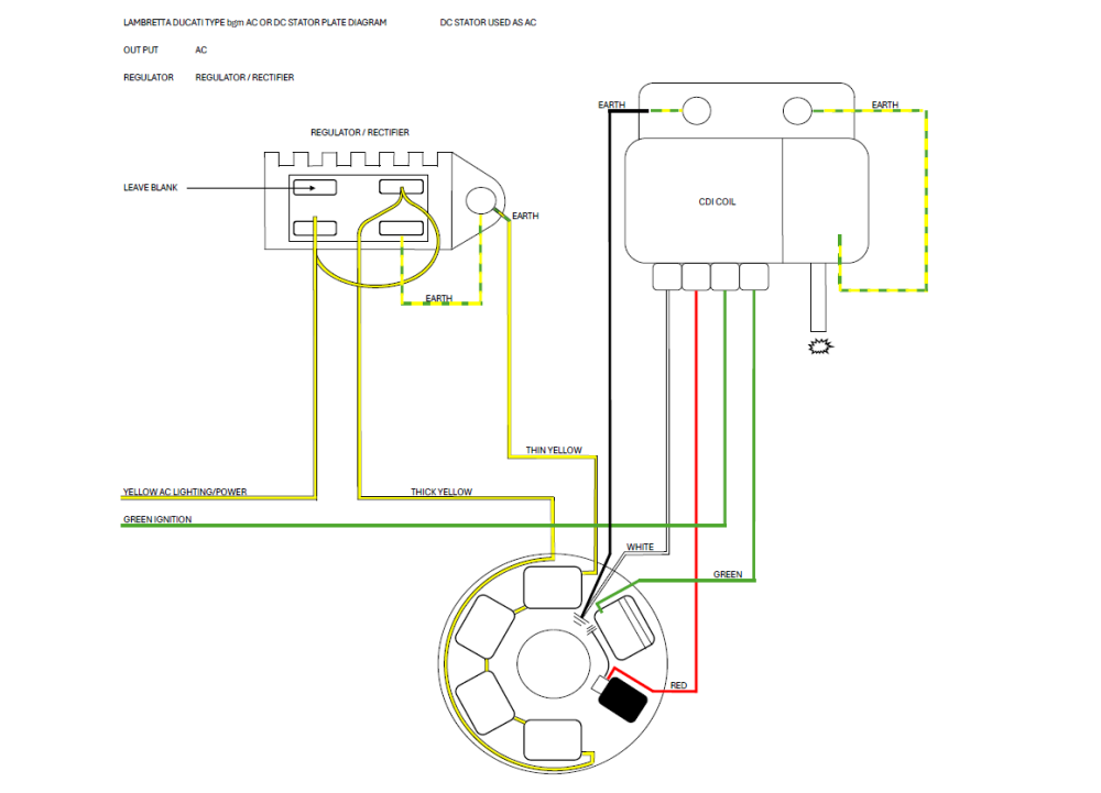 This stator can also be used as an AC stator by using the Yellow with tracer wire to earth on the frame. Thicker Yellow goes to the regulator (AC) or to the bgm Regulator/Rectifier AC/DC.