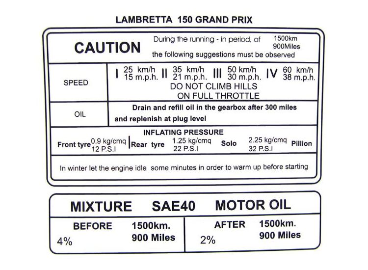 This item is a reproduction of the sticker that you would have had on the inside of the legshields of your new Lambretta.