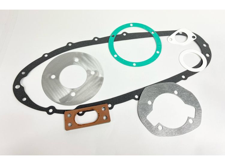This is a complete gasket set for a 175cc Lambretta with a large carburettor and a non-standard exhaust system.